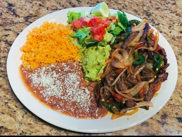Steak cooked in a spicy sauce. Served with rice, guacamole, salad and tortillas.
