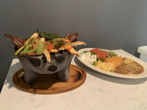 Skirt steak, grilled chicken, shrimp and mushrooms sauteed in a homemade red sauce. Topped with grilled jalapenos peppers, green onions and mozzarella stick. Served with rice and refried beans