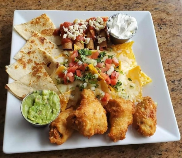 Mini-quesadilla, mini taquitos, plain wings and nachos. Served with guacamole and sour cream.