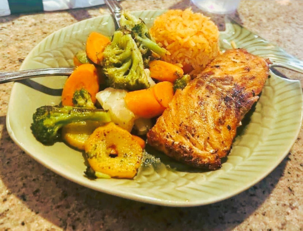 Grilled salmon. Served with rice and mixed vegetables.