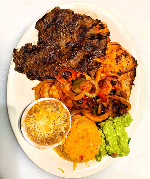 Charbroiled skirt steak with marinated grilled chicken breast and shrimp sautéed with mushrooms, onions and peppers. Served with guacamole, rice and beans