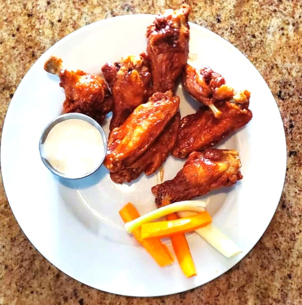 8 Wings with choice of Buffalo, Honey BBQ, or Plain. Served with celery and carrot sticks.